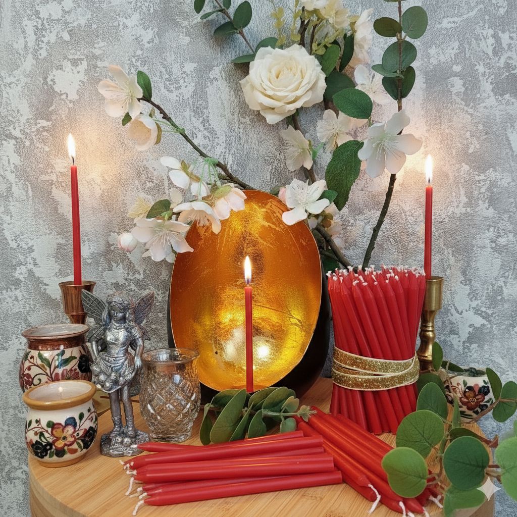 *Красная свеча (два фитиля) — символ страсти и воссоединения. Два фитиля олицетворяют два сердца, что горят в унисон. Она помогает пробудить желание, вернуть нежность и соединить влюблённых даже после разлуки.